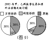 下面两幅统计图(如图8、图9),反映了某市甲、乙两所中学学生参加课外活动的情况.请你通过图中信息回答下面的问题.