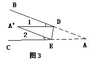 6、如图3,将∠BAC沿DE向∠BAC内折叠,使AD与A’D重合,A’E与AE重合,若∠A=300,则∠1+∠2=( )