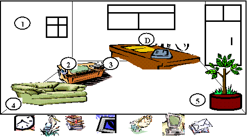 你的朋友买了一套新客厅,他在向你作介绍,请你根据他的介绍,把所给物品的图片放在适当的位置上:(5分)