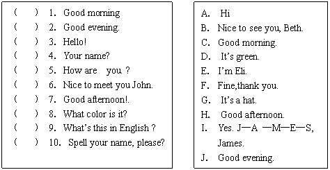一. I. 1—5.ABCBA II.1.╳╳ 2.√√ 3.╳╳ 4.╳╳ 5.╳╳ III.1—5.ACBCB IV. 1—5. ABBCA 二. I. (Omitted) II. 含/ei/读音:HJK, 含/i:/读音:BCDEGPTV, 含 “O”的读音: QW, 含/e/读音: FLMNSXZ III. 1. √ 2. ╳ 3. ╳ 4. ╳ 5.╳ 6. ╳ 7.√ 8. √ 9.╳ 10. √ IV.1. What color is it ? 2. What’s this in English? 3. It’s an orange. 4. It’s black and white. 5. Good morning. V. 1—5. CBABB 6—10. ACBAC VI. 1—5. CJAEF 6–10. BHDGI VII.1. What’s, this, a, colour, it’s 2. your, name, it, you, you’re