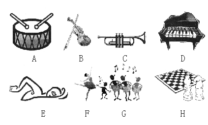 二、A.drum B.violin C.trumpet D.piano E.swim F.dance G.sing H.chess