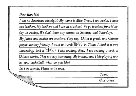 B)假如你是Han Mei,请你参照阅读材料中的相关信息,给Alice回一封信,介绍你