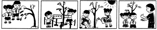 One day Lin Tao and Mei Mei were playing in the garden. They found that a young tree there was dying. They thought they must save the young tree. Then they put a rope around the tree and watered it. Some days later the tree came back to life again. Their mother saw this and praised them, “You are good children!”