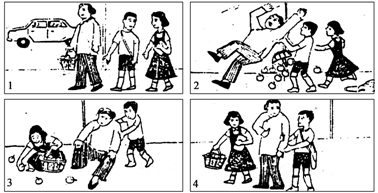 Yesterday afternoon Li Ping and I were going to school. On the way we saw an old woman crossing the street. Suddenly a car passed by very fast. The old woman was frightened and fell down to the ground. The apples in her basket were all out on the street. Immediately, we ran to the old woman, helped her get up and picked up all the apples. Li Ping helped her carry the basket and I helped her cross the street. The old woman thanked us very much.