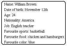 William Brown was born on November 12 th. He is 24 years old. He is from America. He is my English teacher. He likes playing basketball. His favourite food is chicken and hamburgers. He likes blue best.