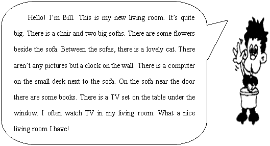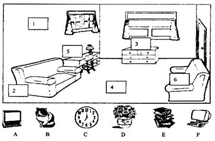 Bill 正在向大家介绍他家的新客厅,你能根据他的介绍,把所给物品的图片放在适当的位置上吗?(把物品下方的字母写在图中相应的位置里)(6分)