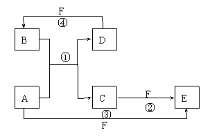 ⑵当A是常见金属单质,D、F是气态单质,且反应①在水溶液中进行,则A+B→C+D的反应是金属置换非金属的反应,则C的最大可能是H2,B是两种气态单质生成的酸,故B为盐酸,F为H2,D为Cl2 ,从C→E的转化可知,A是变价金属,故A为Fe 。