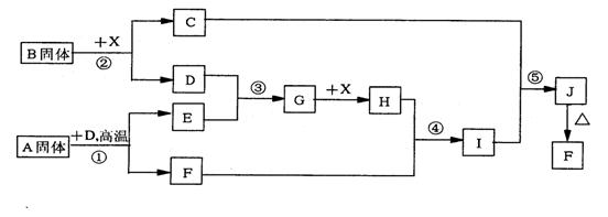 21、(9分)根据下列框图关系填空。已知反应①、③是工业生产中的重要反应,D、E常温下为气体、X常温下为无色液体,H与E相对分子质量之间的关系为:Mr(H)-Mr(E)=34,又知C的焰色反应呈黄色。